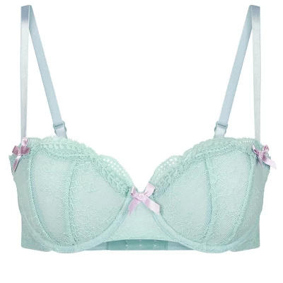 This lace contour balconette bra is made with 3-piece lace cups with lace trim and decorative contrast bows. The bra is underwired and has fully adjustable straps. It also has a hook and eye closure.