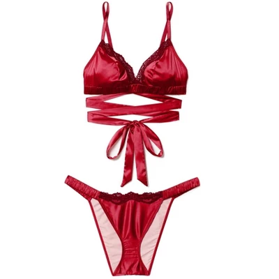 The Averly unlined bralette is a classic style with a twist. This halter-neck bralette is designed in luxurious stretch satin and trimmed with delicate lace. The Brazilian or flutter cheeky panty offers moderate coverage. (Available in XS–XL.)