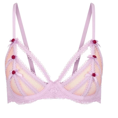 - Unlined sheer cups with strappy picot elastics and rosette bows