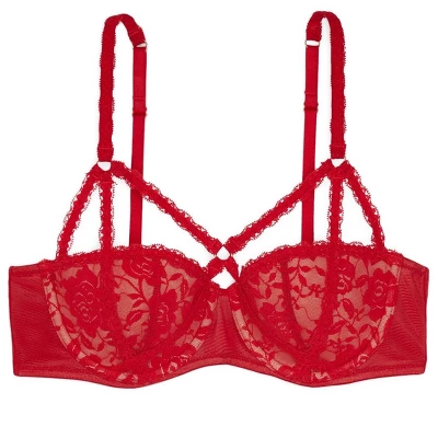 Strap in for a good time with Adore Me’s daring bra featuring floral lace, statement straps, and hardware details.