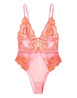 This orange and pink lace bodysuit is a romantic addition to your lingerie drawer. Featuring sheer mesh panels, lace trim, adjustable straps, and an elastic underband that’ll keep you comfortable.