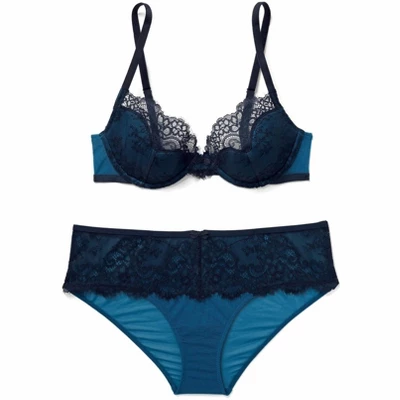 The Evelyn unlined demi bra is designed with eyelash lace and petal-shaped pads for support. This demi bra provides moderate coverage and can be worn with a matching Brazilian or hipster panty.