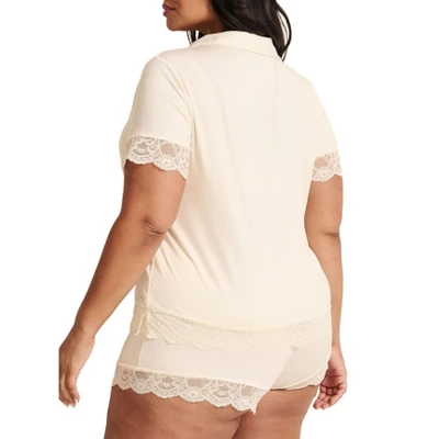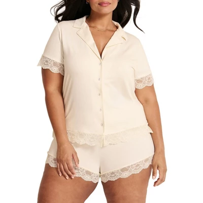 This knit sleepwear set is soft and comfortable, featuring lace trim on the button-down top and matching shorts. This set is the perfect way to add some romance to your PJ drawer.