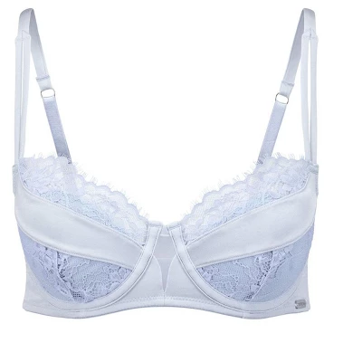 This bra is a contour balconette bra is made with satin fabric and eyelash lace cups, and features adjustable back straps and a hook and eye closure.