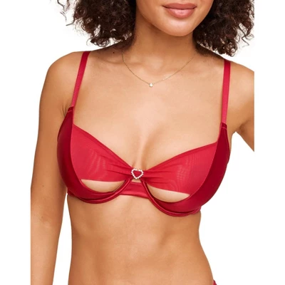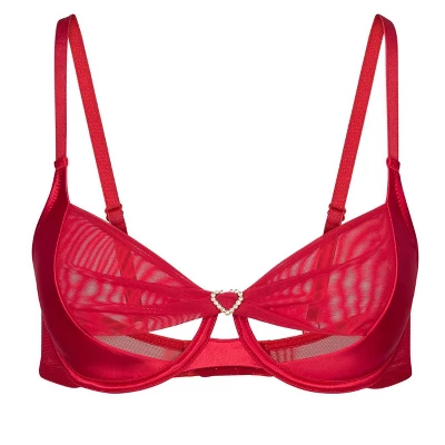 The Libi bra is a bold and fashionable piece of lingerie. It features satin half cups with ruched mesh and a rhinestone heart center front. The bra is also underwired and has adjustable back straps.