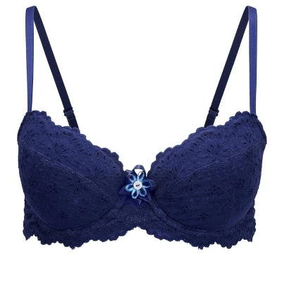 This everyday bra features eyelet lace cups with a sweet bow at the center. The bra is underwired and has fully adjustable straps. It also has a hook and eye closure.