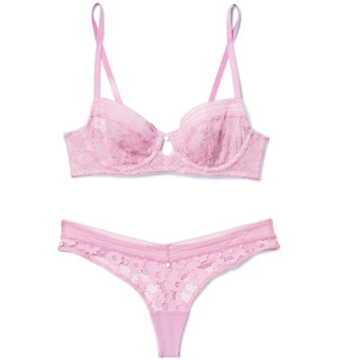 This unlined demi bra is oh-so-romantic. The Nolie set features floral lace cups with a strappy design, a center front keyhole, and an AM logo charm. Complete your set with either the matching thong or hipster panty.