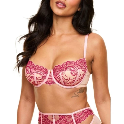 This lace contour balconette bra features a half contour pad for a subtle boost, adjustable straps, and gives you great support, while the faux leather front straps & binding details add a touch of edge.