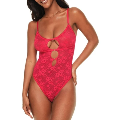 The Piper bodysuit is perfectly sheer with lace detailing that’s just bold enough. She features a plunging v-neckline, thong bottom, adjustable straps, and sexy keyhole cutouts.