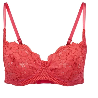 This bra is a romantic sheer fabric unlined balconette bra that is perfect for everyday wear. It features floral lace with fishnet, fully adjustable straps, and a hook and eye closure.